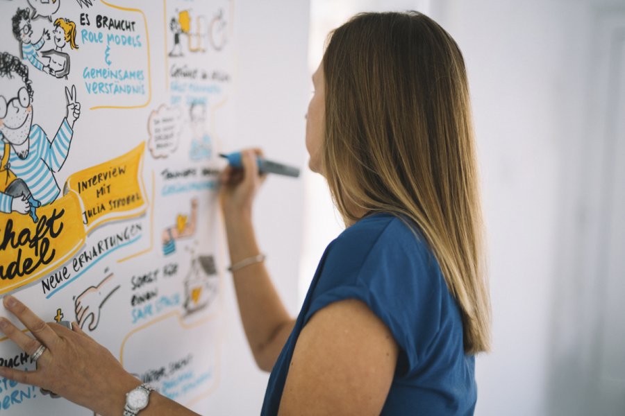 Ja, auf jeden Fall! Je nach Größe der Veranstaltung macht es Sinn, das Team mit mindestens zwei oder mehr Graphic Recordern zu besetzen. Ich bin Mitglied des Visual Pro Camps, einer Community von Profi-Visualisierern, die du dafür buchen kannst. Auf meinen Social Media-Kanälen kannst du sehen, dass Graphic Recording mit mehreren Leuten gut funktioniert und kein ‚Kraut-und-Rüben-Design‘ dabei herauskommt. Dank klarer Absprachen untereinander in Bezug auf Layout und Farbgebung zeichnet zwar jeder in seinem eigenen Stil, aber das Endergebnis wirkt trotzdem sehr harmonisch.